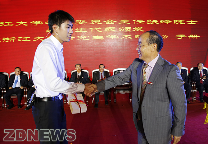 浙江大学学术委员会主任张泽老师为新生代表颁发《浙江大学研究生学术规范手册》。新生代表带领全体新生进行宣誓:“诚信为本,求实崇真;博学慎思,明辨笃行;砥砺品格,主持风气;勇担大任,开物前民。以实际行动不负求是之名!”铮铮誓言,表达了诚信科研、遵守规范的信心和决心。
