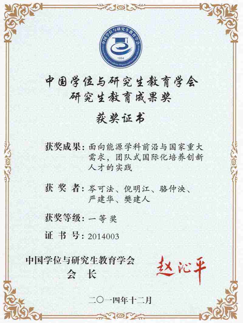 2014年12月22日,由中国学位与研究生教育学会主办的“面向未来,深化改革,建设高质量研究生教育”学会成立20周年纪念大会在京举行。会上颁发了研究生教育成果奖项,由我校岑可法院士、倪明江教授等共同完成的申报项目《面向能源学科前沿与国家重大需求,团队式国际化培养创新人才的实践》荣获实践类一等奖。